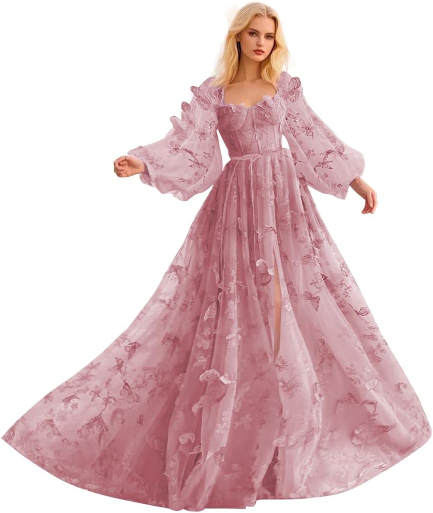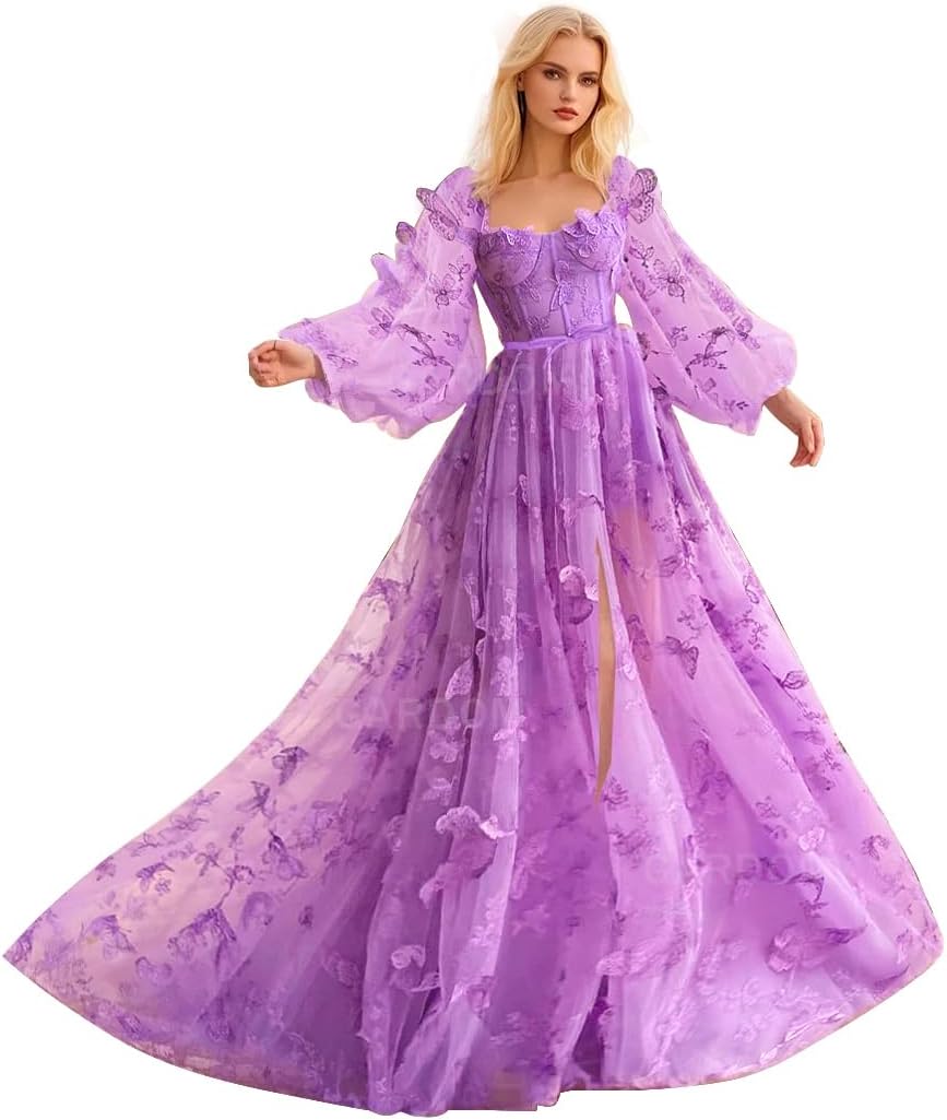 | Fabric Type | Puff Sleeve Tulle Prom Dresses 3D Butterfly Dresses Lace Appliques Ball Gown Corset Prom Dress with Slit |