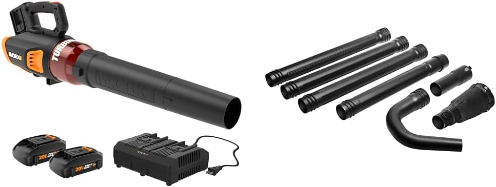 Worx 40V Turbine Leaf Blower Cordless with Battery and Charger, Brushless Motor Blowers for Lawn Care, Compact and Lightweight Cordless Leaf Blower WG584 – 2 Batteries & Charger IncludedGathering leaves just got more gratifying with the Worx 40V Turbine Cordless Leaf Blower. Built with cutting-edge TURBINE fan technology, this cordless blower draws in extra air to deliver robust airflow. With this amplification, it can achieve a max air volume of 430 CFM and a max air speed of 90 MPH—the perfect levels for collecting leaves from large yards, sweeping sidewalks and driveways, clearing patios, and many other tough outdoor cleanup tasks. When you purchase this cordless leaf blower with battery and charger, you'll get the convenience of Power Share. The same 20V Power Share batteries that fuel this blower are compatible with 140+ power tools, outdoor power equipment, and lifestyle products that are part of the Worx Power Share platform. That means you can use all your favorite tools without the nuisance of multiple battery types. Thanks to the tool's High-Efficiency Brushless Motor, you'll get results that outperform many other blowers for lawn care. This brushless motor delivers a 50% longer runtime, 25% more power, and a 10X longer life than standard brushed motor. Adjusting all that performance to fit your specific tasks is made easy with 3-Speed Control Plus TURBO. Simply switch the control to optimize air speed. If you're using the battery leaf blower for light sweeping, choose a lower setting. Need to clear wet leaves or move heavier debris? Let TURBO mode do the heavy lifting with a speed up to 90 MPH. Harnessing all this power won't wear you out, as this user-friendly electric leaf blower is expertly crafted with a lightweight and compact design. Weighing just 7.3 lbs. (w/ battery), it's easy on the body so you won't feel worn out once the job is done. It's also got a sleek user-friendly design for one-handed operation, allowing for more control and flexibility.WORX WG430 13 Amp Electric Leaf MulcherTurn 11 bags of leaves and debris into 1 with the 13 Amp Electric Leaf Mulcher. A whole afternoon’s worth of work can be chopped down into a manageable load, instead of dragging a dozen+ bags to the curb. This tool features a clean air motor cooling system, enabling it to run at peak efficiency and keep mulching up to 53 gallons of leaves per minute. Its 13” cutting diameter is supported by an easy to change string system, so you’ll always have sharp line. Easy to use, easy to maintain, easy to store, it’s lawn clearing made easy.The new Worx leaf mulcher makes collecting leaves easier, quicker and leaves your yard tidier. By simply dropping your leaves into the large feed hole they are mulched to 1/11th their size and drop right into a bag you fit under the unit. Its unique design accepts both plastic and paper bags and delivers an exceptional high mulch efficiency rate of 53 gallons/minute. This is achieved with the safe flex-a-line bladeless mulching system, offering the added benefit of tool-less cutting line replacement. Assembly is also tool-less and coupled with its compact design allows for convenient, easy off-season storage in your garage or shed. The design incorporates a dust reducing clean air motor cooling system and an oversized on/off switch for ease of use. The 13 amp motor delivers 8500 rpm and accommodates a 13-Inch cut diameter all in a package that weighs only 20 lbs. The WG430 comes with 24 replacement lines and 1 universal bag holder.